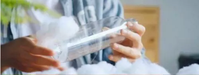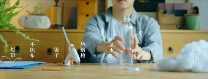 然后将灯带塞入瓶内作为发光源。棉花撕开弄蓬松,用热熔胶慢慢粘满整个瓶身,云朵造型就靠它咯。