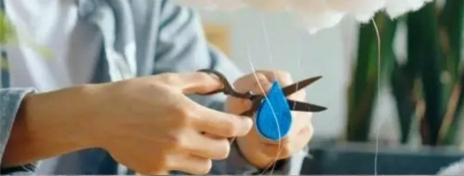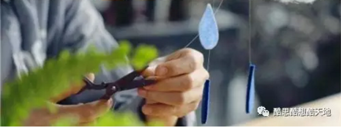 最后用彩色卡纸剪几个不同色的雨滴吊坠,用丝线挂在云朵灯下方作为点缀即可。