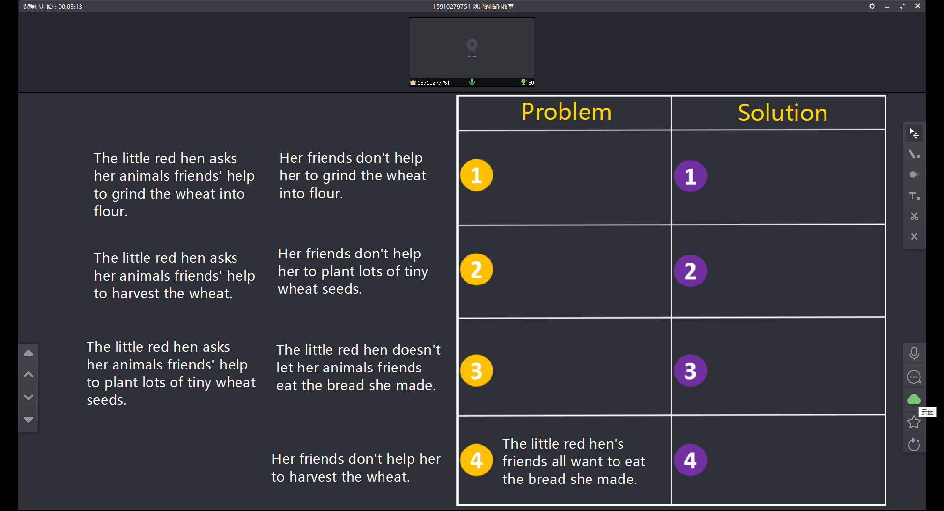 这是G级别的The Little Red Hen一课,明确问题,找到相对应的解决办法(problem & solution),这在美国国家教育大纲(CCSS)中也是一项学生需要掌握的重要的阅读技巧。掌握这个逻辑思维能力,可为学生今后的写作打下基础。