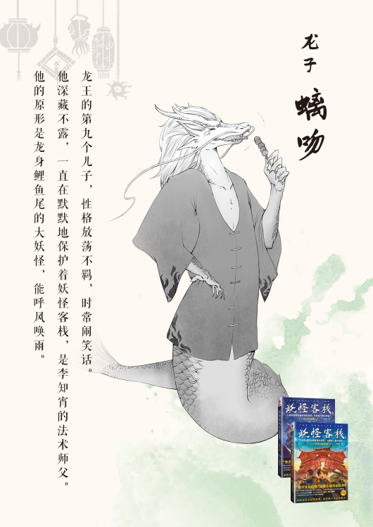 《妖怪客栈》就是专门写龙的九个孩子的故事的。龙的小儿子螭吻成天没事游逛,居然跑去了妖怪客栈,要当客栈的保护人。气坏了他工作狂的姐姐嘲风,天上地下地抓他回去好好教育。螭吻躲着嘲风,撞上了跟伤魂鸟相和正在吵架的蒲牢,结果把睚眦做的铜锁都弄坏了!睚眦气得吹胡子瞪眼。妖界简直就是一团乱麻!龙王老爹究竟会不会出来管管他的九个孩子呢?我们一起来期待吧!