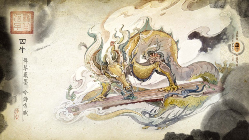 囚牛是个喜欢安静,喜欢弹琴唱歌的龙子。囚牛与他的其他八个兄弟不同,他是个彻头彻尾的文艺青年,脾气好,性格温顺,一点都不像他的龙老爹,有点事儿就吹胡子瞪眼,最好再来一场大雨,淹了人间。囚牛不是这样的,他没事儿爱带着一个胡琴,皎洁的月光下,拉着自己喜爱的曲子。按照现在的说法,囚牛大概是最早的街头艺人了。为什么我的脑海里出现的都是阿炳的《二泉印月》……咳咳,扯远了。总之,囚牛是一位性情温顺,通晓乐理的龙子,还是位大帅哥!嗯嗯,一个会吹拉弹唱的龙子哥哥,坐在花前月下,为你拉上一曲美丽的《二泉印月》,咳咳,不对,《春江花月夜》,这该有多美啊!小读者们,你们想有一位这样的哥哥吗?