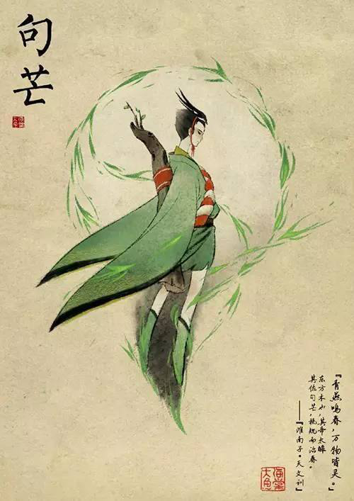 句芒是传说中的春神,也是木神。春天一来,树木发芽生长,句芒就来了。传说太阳每天会从扶桑树升起,扶桑归句芒管,因此,太阳升起的地方,也是句芒的领地。每年春祭,句芒也是其中一位受祭的神祇。句芒的形象一直多变,最初的时候,句芒是鸟身人面的形象,主要的还是以鸟的形象出现。后来,随着神话传说的演变,句芒渐渐变成了人的形象,一个和煦的男人。句芒主管树木,自然农业社会的庄稼也归他管。在中国,句芒是祭祀最重要的神祇之一。祭祀礼仪隆重,体现的是对句芒的重视,更是对农事的重视。农业社会,人吃五谷杂粮,若是春神不给力,那岂不是要坏大事!