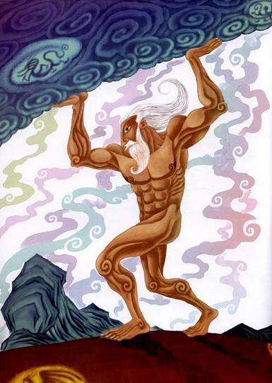 其中有些轻而清的东西,冉冉上升,变成天;另外有些重而浊的东西,沉沉下降,变成地。——当初是混沌不分的天地,就这样给盘古板斧一挥,划分开了。天和地分开以后,盘古怕它们还要合拢,就头顶天,脚踏地,站在天地的当中,随着它们的变化而变化。天每天升高一丈,地每天加厚一丈,盘古的身子也每天增长一丈。这样又过了一万八千年,天升得极高了,地变得极厚了,盘古的身子也长得极长了。